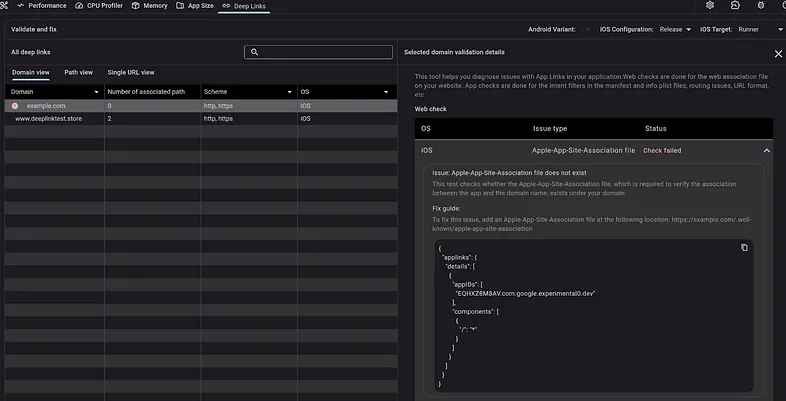 まず、Flutter Deep LinksツールでiOSのディープリンク設定を検証するためのサポートを追加しました。AndroidとiOSのディープリンクを検証できるようになりました。